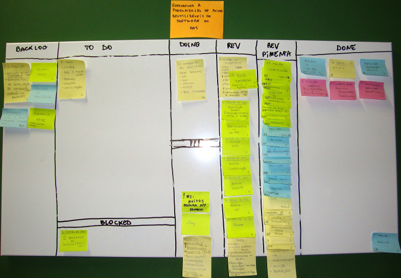 Além destas seis raias, havia um espaço pequeno para as tarefas com algum impedimento de realização, denominadas tarefas bloqueadas (blocked). Ali estavam tarefas relacionadas ao texto que precisavam de algo que eu não tinha no momento, como por exemplo, um artigo que pedi ao meu orientador, ou então algum dado que faltava no experimento do estudo de caso.