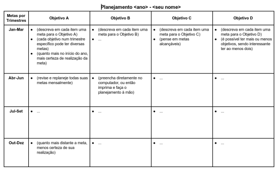 Utilize o modelo de Planejamento Pessoal por Metas Trimestrais por Ano para planejar 2019 desde já.